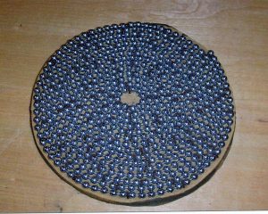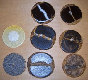 - 馬連 八ッコ、十六ッコ、ボールチェーン(同じ八ッコでも太めの物、細めの物があり必要に応じて使い分ける、十六ッコも同様。左下の馬連はボールチェーンをベニヤ板に留めて作った物で、強く使えばツブシに、軽く使えば摺り跡がはっきりと出る。(細い線を摺る馬連の縄は雁皮(ガンピ)紙に柿シブをぬり、7mmぐらいに切って撚り合わせ十六ッコにしたもの。*摺る時の当て紙はクッキングシートを使っている。