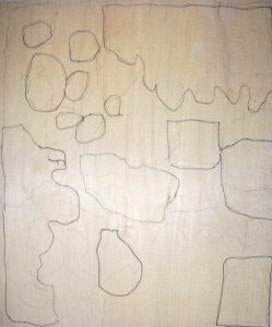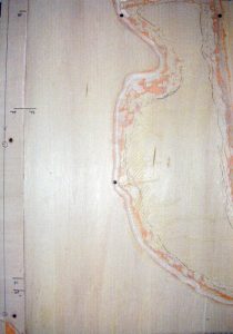 1.転写ー下絵を色彩分解しトレーシングペーパーに写し、カーボン紙で版木に転写。(転写はかなりおおざっぱです。)