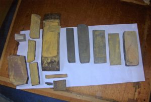 引っ掻きの版木は仕上がったら真ちゅうのワイヤーブラシでこすり、バリを取りラッカーを塗る。次に240番のサンドペーパーを軽く掛ける。*ラッカーを塗るのは引っ掻きの線をよりハッキリさせるため。