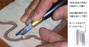 2.彫りー転写の次は彫りになりますが、この時に転写した線よりも下絵を見ながら「刀の彫り味」を活かして進めます。下絵の線ばかり追うと作品が小さくなる様な気がします。