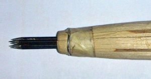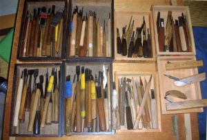 - 彫刻刀 版画を始めた時は版木刀2本、コマスキ4本、アイスキ3本、三角刀は1本と見当ノミでした。それから少しづつ増えて100本以上になりました。