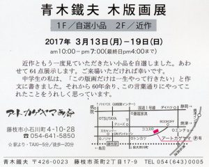 国展 > 展覧会情報 > 版画の展示 > 青木鐵夫 木版画展 青木鐵夫 木版画展 会期:2017年3月13日(月)〜19日(日)am10:00-pm7:00(最終日pm4:00まで) 会場:アートカゲヤマ画廊 藤枝市小石川町4-10-28 Tel054-641-5850藤枝駅よりTaxi-5分/徒歩–20分 作家の作品情報 版画の種類と摺りへ 個展会場風景へ 共有: Facebook で共有するにはクリックしてください (新しいウィンドウで開きます) Facebook クリックして X で共有 (新しいウィンドウで開きます) X 2017/03/13 2017/03/23 版画の展示|個展, 静岡(藤枝) Comment 青木鐵夫 | 国展 より: 2019年6月3日 23:47 […] 1940静岡県生まれ。受賞/国展国画賞・野島賞・前田賞・会友優作賞、中部国展中部国画賞、紙わざ大賞展大賞、トリックアートコンペ奨励賞、浜松百選文芸賞ほか。個展/樹樹画廊(名古屋)、紀伊国屋画廊・養清堂画廊・GALLERYうえすと(東京)、沼津市庄司美術館・島田市博物館分館・静岡カントリーカルチャーフロア(静岡)、四郷版画館(三重)、ペンリス・リージョナルギャラリー(オーストラリア)ほか。出品/現代美術選抜展(文化庁)、サンシャイン版画グランプリ展、現代日本版画′50展(イスラエル)、現代日本版画作家展(アメリカ)、YUKO展(チェコ)、上海半島美術館日本版画招待展・上海国際版画展(中国)ほか。・個展情報:2014/個展情報:2017→ 会場情報 /個展情報:2019 Contemporary Japanese Printmakers 展(シアトル)→展覧会案内 /HP「藤枝静男ー年譜・著作年表」 […]