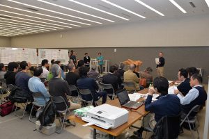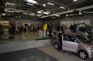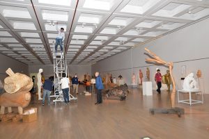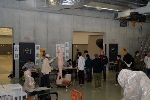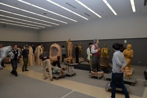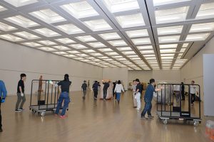 屋内陳列。作品設置が終わると、照明の調整をおこないます。