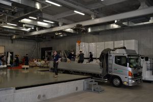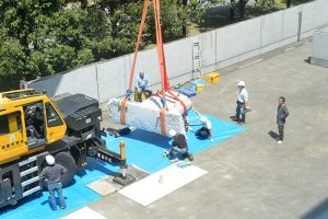 トラックから天井クレーンを使って、重量のある作品を降ろしています。