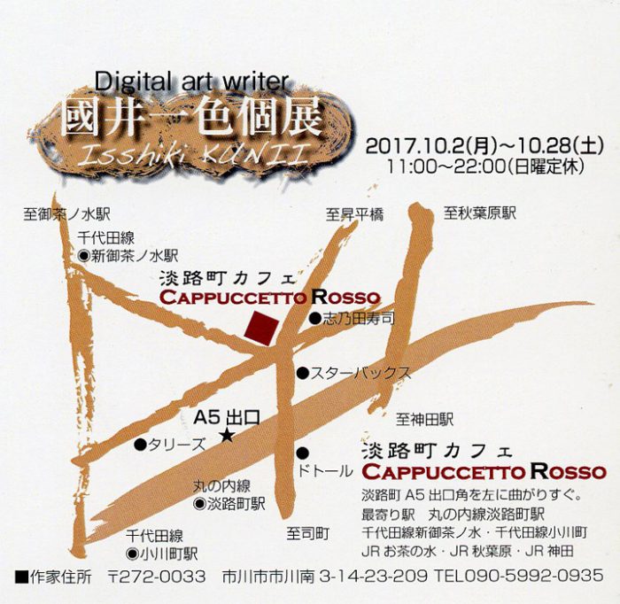 国展 > 展覧会情報 > 版画の展示 > 國井一色 個展_淡路町カフェ 國井一色 個展_淡路町カフェ 國井一色 個展_淡路町カフェ ● 作家の作品情報 ■会期■2017年〜10月2日(月)〜10月28日(土)11:00〜22:00(日曜定休) ■会場■淡路町カフェ(CAPPUCCETTO ROSSO) 淡路町A5 出口角を左に曲がりすぐ。(最寄り駅 丸ノ内線淡路町駅ほかmap通り) 共有: Facebook で共有するにはクリックしてください (新しいウィンドウで開きます) Facebook クリックして X で共有 (新しいウィンドウで開きます) X 2017/10/02 2017/10/02 版画の展示|個展, 東京, 淡路町