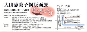 国展 > 展覧会情報 > 版画の展示 > 大山恵美子銅版画展_ギャラリー男蔵 大山恵美子銅版画展_ギャラリー男蔵 ー時の光とかげー ● 作家の作品情報 ■ 会期 ■ 2017年10月8日(日)〜15日(日)午前10:00〜午後6:00(会期中無休) ■ 会場 ■ ギャラリー男蔵 群馬県みどり市大間々町高津戸530 Tel;0277-72-1221 Fax:0277-72-1256 クリックで拡大ー 共有: Facebook で共有するにはクリックしてください (新しいウィンドウで開きます) Facebook クリックして X で共有 (新しいウィンドウで開きます) X 2017/10/08 2017/10/08 版画の展示|個展, 群馬
