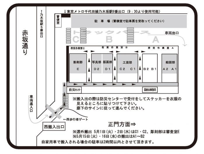 - 彫刻部を除く国画賞・新人賞・会友賞受賞作品と写真部指定の賞受賞作品は名古屋展・大阪展へ巡回となります。東京搬出は6月23日(土)・24日(日)、日本美術商事(株)倉庫にて行われます。該当者は搬出日に注意してください。業者を使用する予定の方は業者に必ず連絡してください。