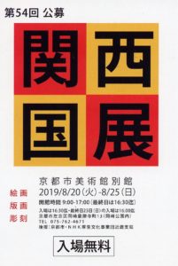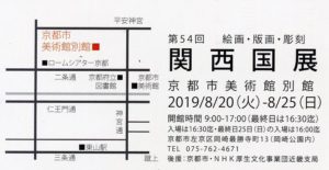 国展 > 展覧会情報 > 地方の国展 > 関西国展_京都市美術館別館 関西国展_京都市美術館別館 第54回公募 絵画 版画 彫刻 ■会 期■ 2019年8月20日(火)~25日(日) 9:00~17:00(最終日は16:30まで) *入場は16:30迄・最終日25日の入場は16:00迄 *入場無料 ■会 場■ 京都市美術館別館 京都市左京区岡崎最勝寺町13(岡崎公園内)TEL 075-762-4671 ■後 援■ 京都市・NHK厚生文化事業団近畿支局 共有: Facebook で共有するにはクリックしてください (新しいウィンドウで開きます) Facebook クリックして X で共有 (新しいウィンドウで開きます) X 2019/08/20 2019/10/09 地方の国展, 展覧会情報, 彫刻の展示, 版画の展示, 絵画の展示|京都, 地方国展