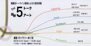 国展 > 展覧会情報 > 工芸の展示 > 2nd 5トーク5アート 国画会トークイン委員による5部合同展_銀座 ギャラリーあづま 2nd 5トーク5アート 国画会トークイン委員による5部合同展_銀座 ギャラリーあづま 会期:2019年10月14日(月)~20日(日) 11:00~18:30(最終日~16:00) 会場:銀座 ギャラリーあづま 〒104-0061 東京都中央区銀座5-9-14 銀座ニューセントラルビル1F 織会員小宮三代子さん、染会員坂田峰子さん、織準会員浅倉広美さんが参加する展覧会です。 共有: Facebook で共有するにはクリックしてください (新しいウィンドウで開きます) Facebook クリックして X で共有 (新しいウィンドウで開きます) X 2019/10/14 2019/10/14 工芸の展示|銀座