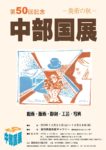 中部国展は、東海地区の新人発掘の為、1962年7月23日から30日まで第1回展が旧愛知県美術館で開催されました。鑑査には、杉本健吉先生の盟友でもあった関西の須田剋太先生が駆けつけ、参加されたこともあります。絵画部、版画部、工芸部、写真部四部での出発で、第3回展からは彫刻部も出来ました。名古屋展(巡回展)同様、当時は出品者が少なかったので、会場の半分を利用し、新人展、九人展も開催されました。 2012年には、第50回記念展が愛知県美術館で開催され、ポスターは、島田章三会員に作画をお願いし、中部国展 を紹介するチラシも作成しました。又、記念展企画として、ポスター画を使用したポストカードを来場者全員に進呈しました。懇親会には、会務委員、事務局、各部事務所、支部事務所の方を始め、地元関係者の方々にも大勢参加して頂き、記念展にふさわしい盛会となりました。2014年第52回中部国展も盛会の内に無事終了しました。 今後も地方支部展の先駆けとして東海地区の美術振興に努めていきます。
