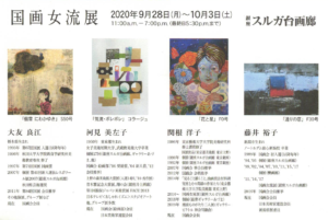国展 > 展覧会情報 > 絵画の展示 > 国画女流展_スルガ台画廊 国画女流展_スルガ台画廊 ■会期■2020年9月28日(月)〜10月3日(土) ■会場■スルガ台画廊 東京都中央区銀座6-5-8 トップビル2F TEL:03-3572-2828 入場時間:11:00〜19:00 ※最終日17:30まで 共有: Facebook で共有するにはクリックしてください (新しいウィンドウで開きます) Facebook クリックして X で共有 (新しいウィンドウで開きます) X 2020/09/28 2020/09/28 絵画の展示|グループ展, 銀座