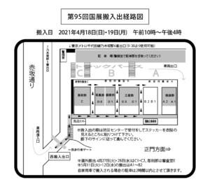 - 彫刻部を除く国画賞・新人賞・会友賞と写真部指定の賞受賞作品は名古屋展・大阪展へ巡回となります。東京搬出は7月3日(土)・4日(日)に日本美術商事(株)倉庫にて行われます。該当者は搬出日に注意してください。業者を使用する予定の方は業者に必ず連絡してください。