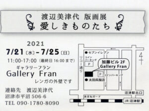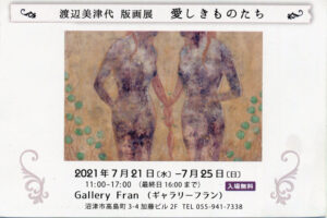 国展 > 展覧会情報 > 版画の展示 > 渡辺美津代 版画展_沼津Gallery Fran 渡辺美津代 版画展_沼津Gallery Fran 渡辺美津代 版画展 愛しきものたち ■会 期■ 2021年7月21日(水)~25日(日) 11:00~17:00(最終日は16:00まで)入場無料 ■会 場■ Gallery Fran(ギャラリー フラン) 沼津市高島町3−4 加藤ビル2F TEL 055-941-7338 作家ページ 共有: Facebook で共有するにはクリックしてください (新しいウィンドウで開きます) Facebook クリックして X で共有 (新しいウィンドウで開きます) X 2021/07/21 2021/07/21 版画の展示|個展, 沼津