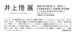 国展 > 展覧会情報 > 絵画の展示 > 井上悟 展_日本橋髙島屋 井上悟 展_日本橋髙島屋 井上悟展 ■会期■ 2021年7月21日(水)〜27日(火) ■会場■ 日本橋髙島屋S.C. 本館6階美術画廊 Tel.03-3211-4111 共有: Facebook で共有するにはクリックしてください (新しいウィンドウで開きます) Facebook クリックして X で共有 (新しいウィンドウで開きます) X 2021/07/21 絵画の展示|井上悟, 国画会