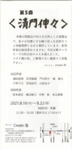 国展 > 展覧会情報 > 絵画の展示 > 第5回清門伸々_Create洛 第5回清門伸々_Create洛 ■会期■2021年8月10日(火)〜8月22日(日) 11:30〜18:30 (最終日は17:00まで) 16日(月)休廊 ■会場■Create洛 京都市中京区丸太町通堺町通鍵屋町69 TEL:075-708-7898 入場時間:11:30〜18:30 ※最終日17:00まで 共有: Facebook で共有するにはクリックしてください (新しいウィンドウで開きます) Facebook クリックして X で共有 (新しいウィンドウで開きます) X 2021/08/10 2021/08/10 絵画の展示|2人展, グループ展