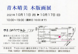 国展 > 展覧会情報 > 版画の展示 > 青木晴美 木版画展_藤枝アートカゲヤマ画廊 青木晴美 木版画展_藤枝アートカゲヤマ画廊 青木晴美 木版画展 ■会 期■ 2021年10月11日(月)~17日(日) 10:00~19:00(最終日 16:00まで) ■会 場■ アートカゲヤマ画廊(2F) 藤枝市小石川町4ー10ー28 TEL 054-641-5850 作家ページ 共有: Facebook で共有するにはクリックしてください (新しいウィンドウで開きます) Facebook クリックして X で共有 (新しいウィンドウで開きます) X 2021/10/11 2021/10/11 展覧会情報, 版画の展示|個展, 静岡(藤枝)