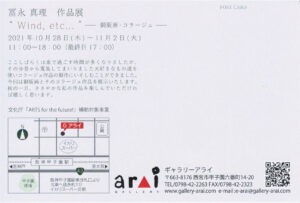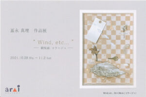 国展 > 展覧会情報 > 版画の展示 > 冨永 真理 作品展_ギャラリーアライ 冨永 真理 作品展_ギャラリーアライ 冨永真理 作品展 ” Wind,etc・・・” ー銅版画・コラージュー ■会 期■ 2021年10月28日(木)~11月 2日(火) 11:00~18:00(最終日 17:00まで) ■会 場■ ギャラリーアライ 〒663-8176西宮市甲子園六番町14-40 TEL/0798-42-2263FAX/0798-42-2323 作家ページ 共有: Facebook で共有するにはクリックしてください (新しいウィンドウで開きます) Facebook クリックして X で共有 (新しいウィンドウで開きます) X 2021/10/28 2021/10/28 展覧会情報, 版画の展示|個展, 神戸