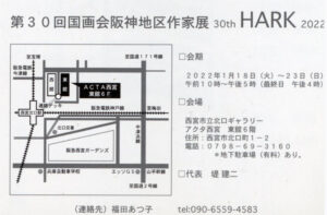 国展 > 展覧会情報 > 版画の展示 > 第30回 国画会 阪神地区作家展_西宮市立北口ギャラリー 第30回 国画会 阪神地区作家展_西宮市立北口ギャラリー 第30回 国画会 阪神地区作家展 □絵画 □版画 ■ 会期2022 1月18日(火)~23日(日)午前10時~午後5時(最終日午後4時まで) ■ 会場 西宮市立北口ギャラリー アクタ西宮 東館6階 ■ 住所 西宮市北口町1-2 電話 0798-69-3160 *地下駐車場(有料)あり 共有: Facebook で共有するにはクリックしてください (新しいウィンドウで開きます) Facebook クリックして X で共有 (新しいウィンドウで開きます) X 2022/01/18 2022/01/18 展覧会情報, 版画の展示, 絵画の展示|作家展, 兵庫, 西宮