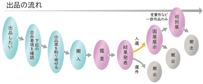 ※写真の裏面中央に氏名、題名、サイズ(高さ、巾、奥行きの順)、材質名を楷書で明記。写真は陳列と図録撮影に使用され、返却されません。 - 入選者は陳列、撤去作業に出来るだけ参加してください。搬出は閉会日の撤去作業完了後にも行えます。