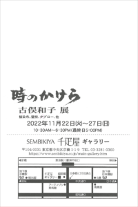 国展 > 展覧会情報 > 工芸の展示 > 古俣和子展「時のかけら」_千疋屋ギャラリー(京橋) 古俣和子展「時のかけら」_千疋屋ギャラリー(京橋) 【会期】2022年11月22(火)~27日(日) 10:30~18:30(最終日 17:00迄) 【場所】千疋屋ギャラリー 〒104-0031 東京都中央区京橋1丁目1−9 TEL.03-3281-0360 共有: Facebook で共有するにはクリックしてください (新しいウィンドウで開きます) Facebook クリックして X で共有 (新しいウィンドウで開きます) X 2022/11/22 2022/11/22 展覧会情報, 工芸の展示|古俣和子, 国展, 工芸, 染