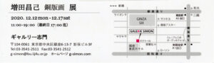 国展 > 展覧会情報 > 版画の展示 > 増田昌己 銅版画 展_銀座ギャルリー志門 増田昌己 銅版画 展_銀座ギャルリー志門 ■会期■2022年12月12日(月)~12月17日(土) ■時間■ 11:00~19:00 ※最終日17:00まで ■会場■銀座 ギャルリー志門 東京都中央区銀座6-13-7 新保ビル3階 TEL:03-3541-2512 作家ページ 共有: Facebook で共有するにはクリックしてください (新しいウィンドウで開きます) Facebook クリックして X で共有 (新しいウィンドウで開きます) X 2022/12/12 2023/01/30 展覧会情報, 版画の展示|