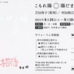 国展 > 展覧会情報 > 彫刻の展示 > 芝田典子(彫刻)/村田純江(絵画)展_宇フォーラム美術館 芝田典子(彫刻)/村田純江(絵画)展_宇フォーラム美術館 こもれ陽☼陽だまり 展 ■会期■2023年8月24日(木)~9月10日(日)※休館日:月・火・水曜日 ■時間■13:00~18:00 ※最終日 16:00まで ■会場■宇フォーラム美術館 ※入館料 500円 中学生以下無料 東京都国立市東4-21-10 TEL 042-580-1557 共有: Facebook で共有するにはクリックしてください (新しいウィンドウで開きます) Facebook クリックして X で共有 (新しいウィンドウで開きます) X 2023/08/24 2023/08/24 彫刻の展示, 絵画の展示|2人展, 東京・国立