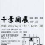 国展 > 展覧会情報 > 写真の展示 > 千葉国展_千葉市美術館9F 市民ギャラリー 千葉国展_千葉市美術館9F 市民ギャラリー 絵画・彫刻・版画・写真・工芸 ■会期■2023年12月19日(火)~ 12月24日(日) ■時間■10:00~18:00 ※最終日 16:00まで ※絵画部講評会:12/23(土)13:00~ ■会場■千葉市美術館9F 市民ギャラリー 千葉県千葉市中央区中央3-10-8 TEL:043-221-2311 共有: Facebook で共有するにはクリックしてください (新しいウィンドウで開きます) Facebook クリックして X で共有 (新しいウィンドウで開きます) X 2023/12/19 2023/12/19 写真の展示, 工芸の展示, 彫刻の展示, 版画の展示, 絵画の展示|千葉, 地方展