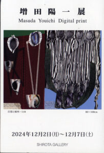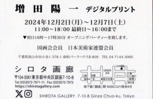 国展 > 展覧会情報 > 版画の展示 > 増田陽一 展 増田陽一 展 増田陽一 デジタルプリント ●会期; 2024年12月2日(月)〜12月7日(土)11:00〜18:00 (最終日は16:00時)初日16時~17時30分 オープニングパーティーを致します。 ●会場;東京都中央区銀座7-10-8第五太陽ビルB1F 03(3572)7972 シロタ画廊 作家のページへ 共有: Facebook で共有するにはクリックしてください (新しいウィンドウで開きます) Facebook クリックして X で共有 (新しいウィンドウで開きます) X 2024/12/02 2024/12/02 展覧会情報, 版画の展示|個展, 銀座