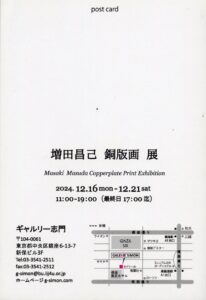 国展 > 展覧会情報 > 版画の展示 > 増田昌己 銅版画 展_銀座 ギャルリー志門 増田昌己 銅版画 展_銀座 ギャルリー志門 増田昌己 銅版画 展 ■会期 2024.12.16(月)~12月21(土)11:00~19:00(最終日17:00まで) ■会場 東京都中央区銀座6-13-7 新保ビル3F ギャルリー志門 作家のページへ 共有: Facebook で共有するにはクリックしてください (新しいウィンドウで開きます) Facebook クリックして X で共有 (新しいウィンドウで開きます) X 2024/12/16 2024/12/16 版画の展示|個展, 銀座