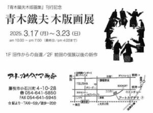 国展 > 展覧会情報 > 版画の展示 > 青木鐵夫 木版画展 「青木鐵夫 木版画集」刊行記念 青木鐵夫 木版画展 「青木鐵夫 木版画集」刊行記念 青木鐵夫 木版画展 「青木鐵夫 木版画集」刊行記念 今春に代表作約300点以上を総覧できる木版画集を阿部出版より刊行予定。 新作の他、自選による旧作も展示予定。 ■2025年3月17日(月)〜23日(日) am10:00〜pm7:00 最終日/pm4:00まで ■アートカゲヤマ画廊 静岡県藤枝市小石川町4-10-28 http://www.artkageyama.com Tel.054-641-5850 共有: Facebook で共有するにはクリックしてください (新しいウィンドウで開きます) Facebook クリックして X で共有 (新しいウィンドウで開きます) X 2025/03/17 2025/03/17 お知らせ, 展覧会情報, 版画の展示, 版画部, 版画部ニュース|国展版画部
