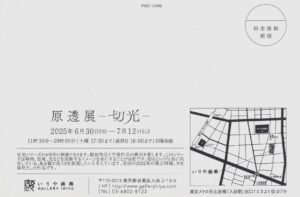 国展 > 展覧会情報 > 彫刻の展示 > 原 透 展-切光-_いりや画廊 原 透 展-切光-_いりや画廊 原 透 展-切光-_いりや画廊 ■会期■2025年6月30日(月)~ 7月12日(土) ■時間■11:00~1900 土曜日17:30 日曜日休廊(最終日は16:00まで) ■会場■いりや画廊 東京都台東区入谷2-13-8 TEL:03-6802-8122 共有: Facebook で共有するにはクリックしてください (新しいウィンドウで開きます) Facebook クリックして X で共有 (新しいウィンドウで開きます) X 2025/06/30 2025/06/30 展覧会情報, 彫刻の展示|個展, 東京