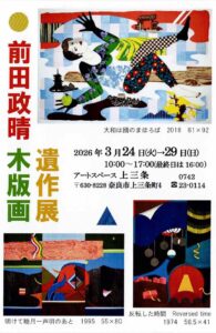 国展 > 展覧会情報 > 版画の展示 > 前田政晴 木版画遺作展 前田政晴 木版画遺作展 前田政晴 木版画遺作展 ■期間 2026/3/24(火) ー 3/29(日) 10:00 〜17:00 最終日16日(日)16:00まで ■場所 アートスペース上三条 奈良県上三条町4 近鉄奈良駅から徒歩5分、JR奈良駅から徒歩8分 TEL 0742-23-0114 共有: Facebook で共有 (新しいウィンドウで開きます) Facebook X で共有 (新しいウィンドウで開きます) X 2026/02/25 お知らせ, 展覧会情報, 版画の展示, 版画部, 版画部ニュース, 遺作展|