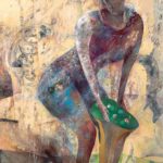 この度絵画部奨励賞をいただきまた準会員に推挙いただき身の引き締まる思いです。「古代への憧れ」をテーマに縄文時代、マヤ文明などの遺跡や土器など古代人が造形してきたものを自分なりに表現したくいろいろな素材を使いながら作品づくりをしてきました。今は古代人の風の軌跡を感じるような作品ができたらという思いです。これを機会に一層絵の世界を広げていきたいと思います。